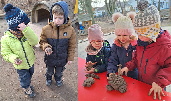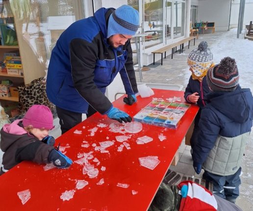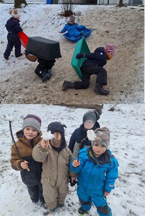 Ausnahmsweise beginnt das Jahr mal traditionell mit Schnee. Diese Gelegenheit lassen wir uns nicht entgehen. Dabei kommen kreative Ideen auf wie Wannen- oder Kehrblech-Rodeln. Dazu auch freies Schneerutschen. Es gab auch den Versuch eines Erziehers, Eisfiguren sowie bunte Eisklötze für die Kinder zu machen. Aber dafür war es dann doch nicht kalt genug gewesen. Wiederum andere „grillen“ lieber ein paar „Marshmallows“ an Stöcken, damit ihnen wieder warm wird?