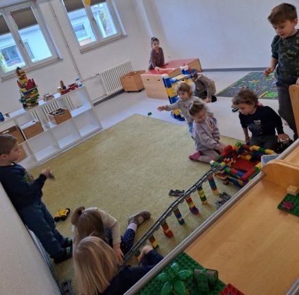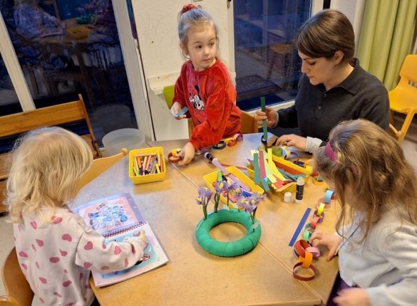 In der Turnhalle sind Parcours und Freispiel mit den Turngeräten sowie Spielmaterialien jederzeit beliebt. Sollten Frost mit Regen und Sturm den Garten beherrschen, so bleiben wir auch mal drinnen und leben unsere Fantasie aus. Drinnen basteln und malen wir Krokusse sowie Schneeglöckchen und prickeln Schneeflocken. Da auch bald Fasching stattfindet, basteln wir Girlanden zum Schmücken unseres Gruppenraumes.
