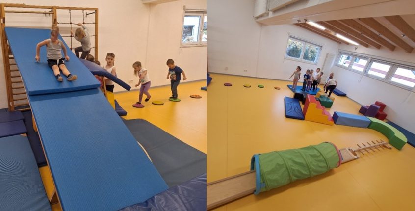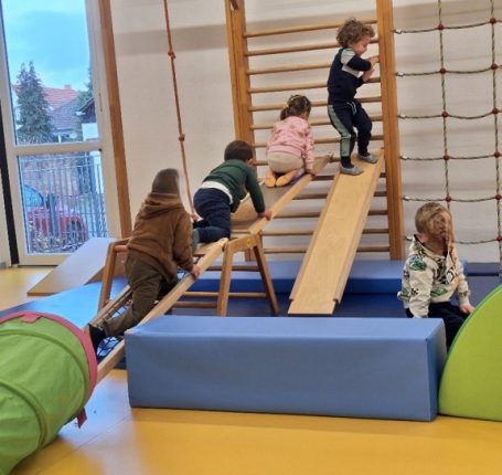 Mit dem ersten Schnee kam die Idee auf, wir könnten unser Turnen dem anpassen. Somit überquerten die Jüngeren den „Eishügel-Pfad mit Tunnel“. Unsere Älteren hingegen überwanden den Eisschollen-See, eine Gletscherwand und den Schlitterhang.
