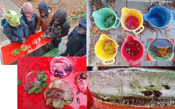 Da es Mal frostig werden sollte über Nacht, stellten wir Eimer mit gefärbtem Wasser raus und legten Naturmaterialien hinein. Nach dem Wochenende war das Wasser teilweise gefroren. Dabei entdeckten wir, dass die Tinte langsamer gefror als das Wasser selbst.